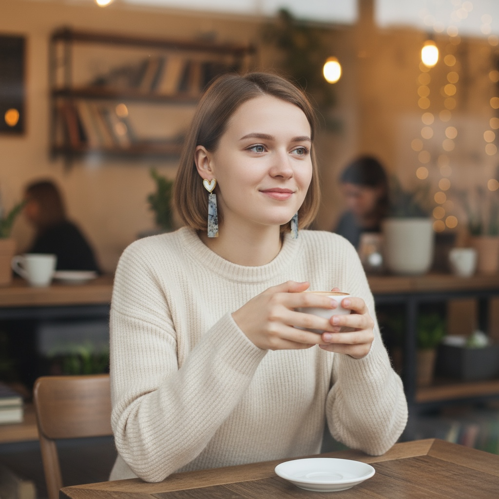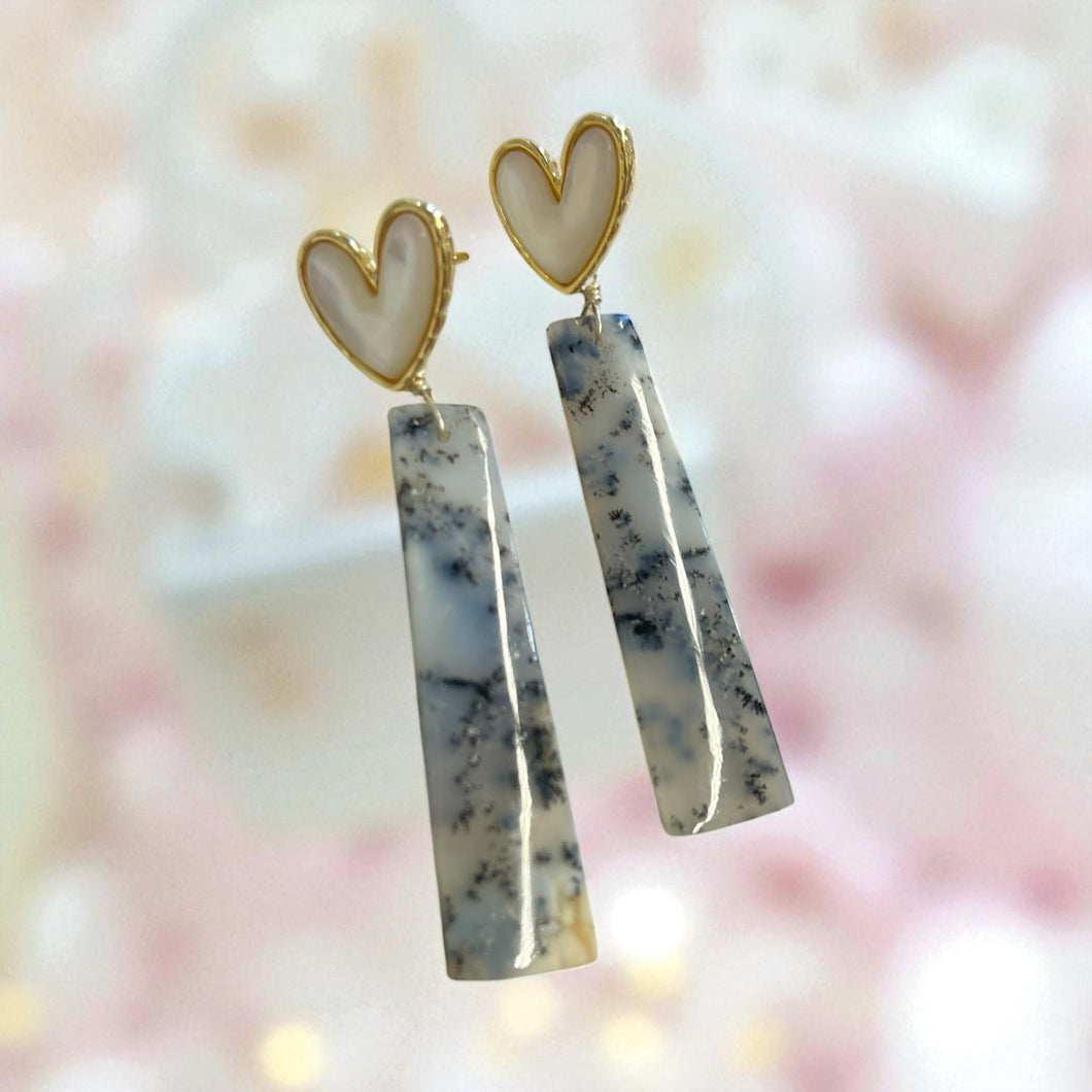 Elegant long earrings, 53mm in length, showcasing square dentritic opals with silver stud hearts.