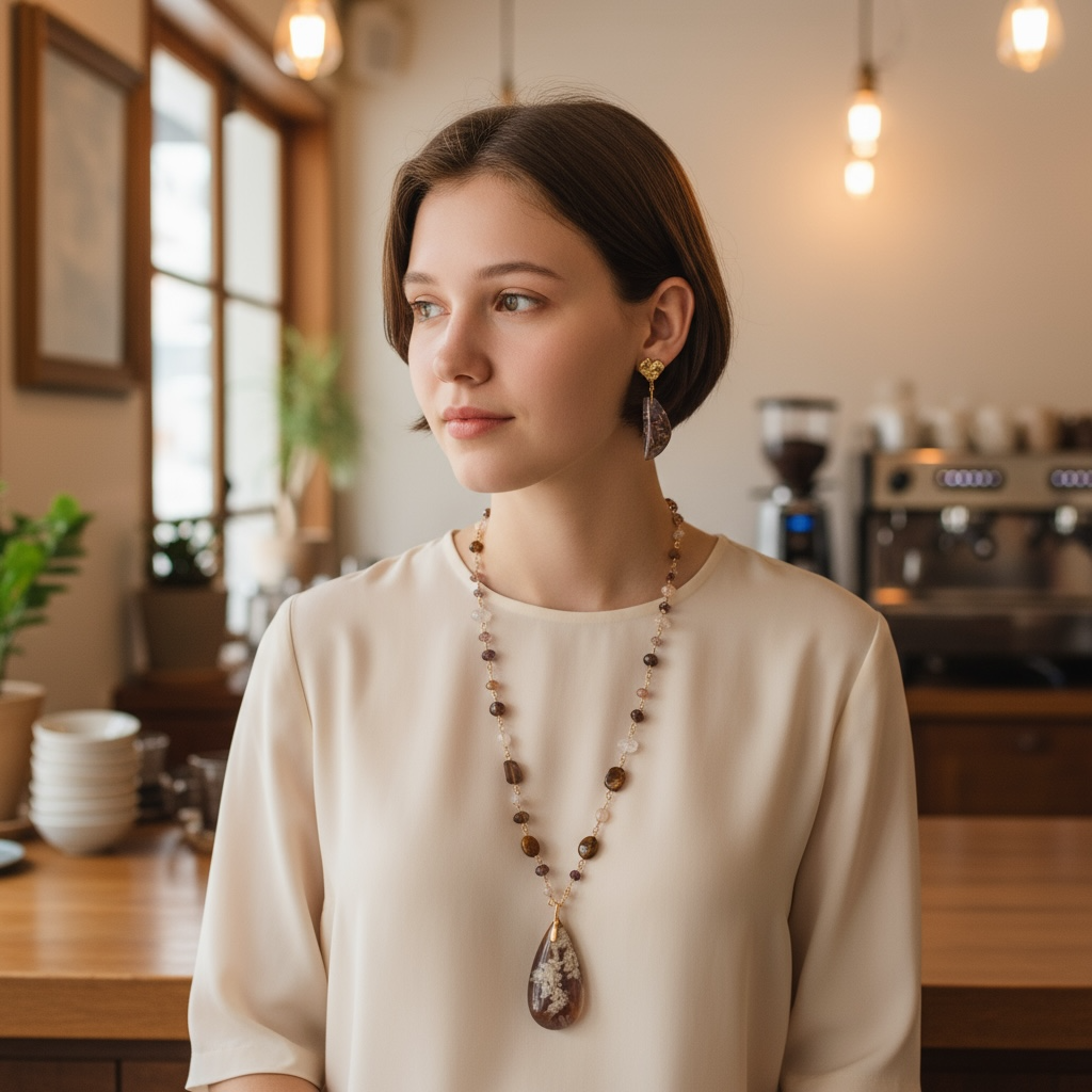 Necklace with Feather Agate in brown beige, topaz, smoky and rutilated quartz and phantom quartz all in rose gold over sterling silver .925 wires