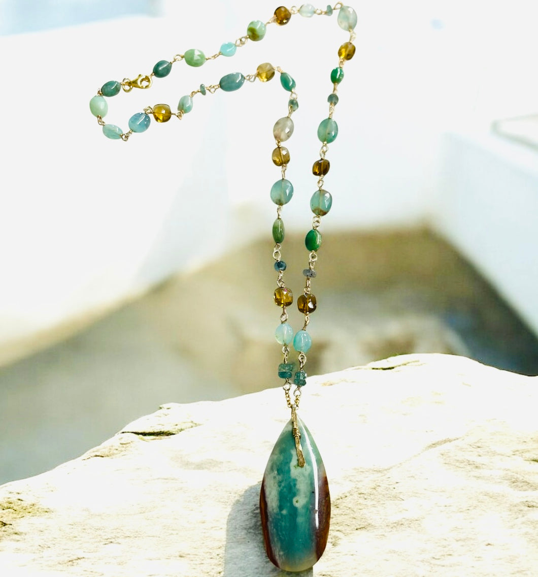 Breath-taking necklace with beige, brown, light blue and dark brown of petrified opalized wood. It comes with stunning gems like smoky quartz, emeralds, aquaprase, topaz all in gold filled 14k wires