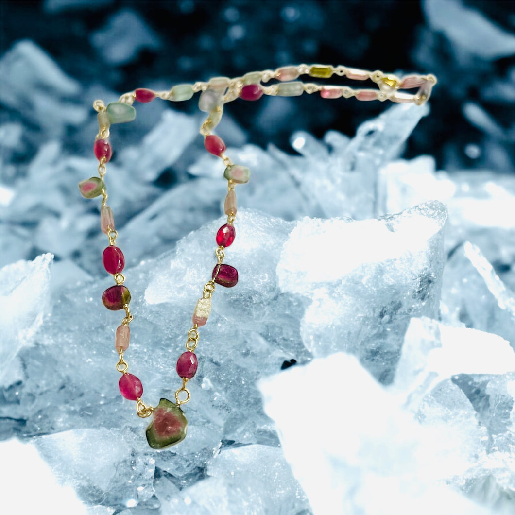 necklace, gold filled over sterling silver wire, 18 inches long with tourmalines (watermelon- pink- bio and teal) and pink sapphires.