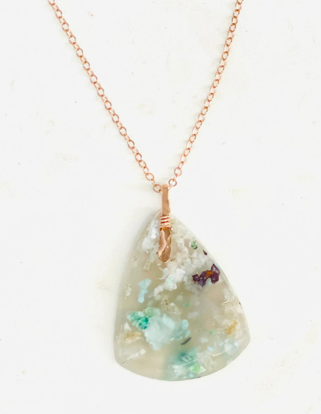 So unique shape and patterns in this chrysocolla copper on quartz together with rose gold filled 14k for chain in adjustable 20 inches long