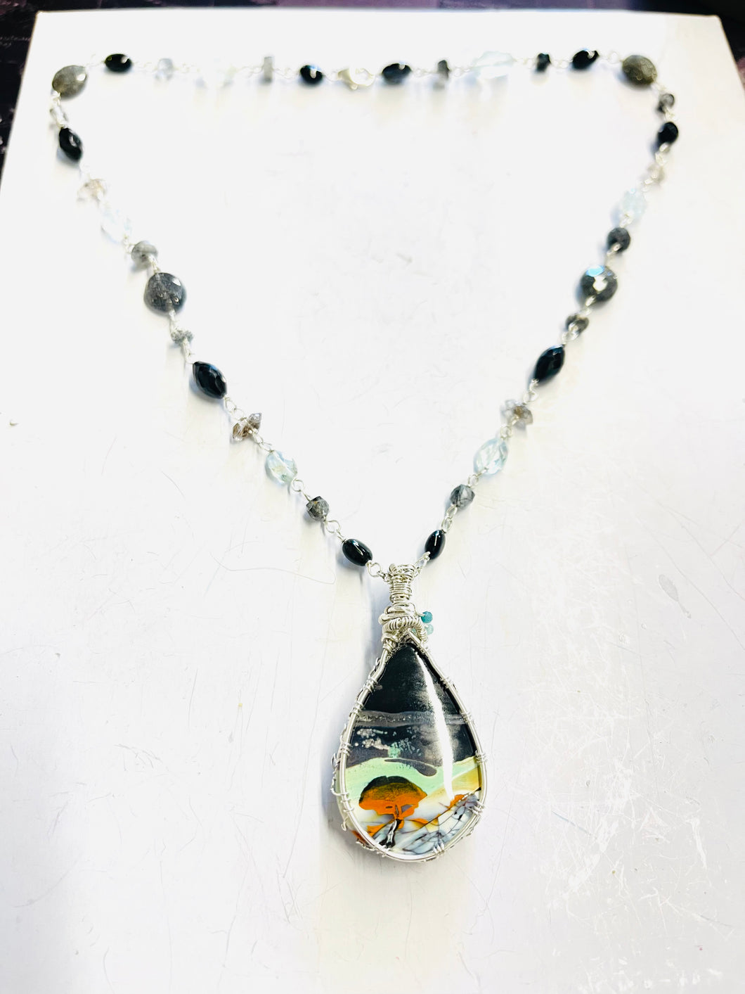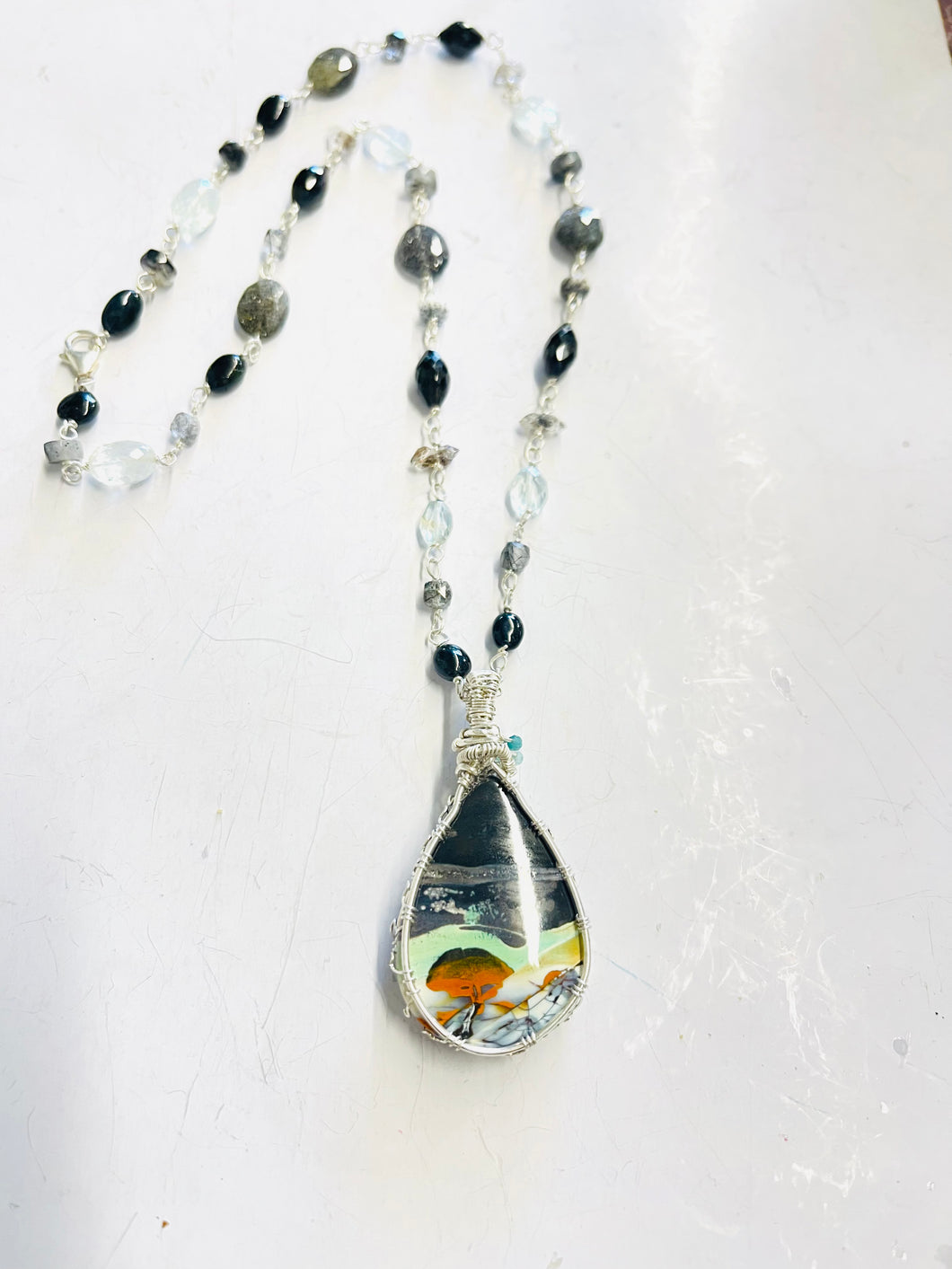 Necklace long as 20inches, with natural copper in chrysocolla with exquisite color combination of light green-blue and dark copper mixed amazingly together. I have added apatite, andalusite, smoky quartz, Ametrin and sunstone beads all in rose gold filled 14k over sterling silver wires.