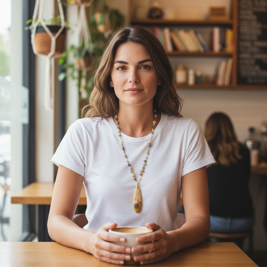 Long as 22 inches this spectacular, top fashion necklace with one of the kind light shades petrified palm root with rutilated quartz, black tourmaline, petrified palm root beads all in gold 14k over sterling silver.